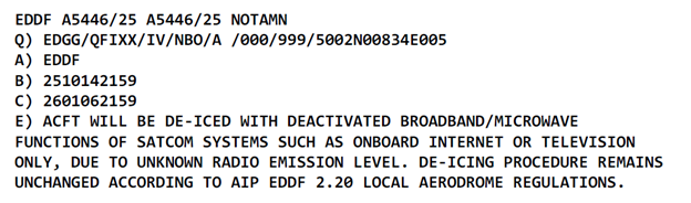 Finally, take the time to check NOTAMs and other official documents for requirements. For example, Frankfurt Main (EDDF) has a restriction on deactivating Broadband/Microwave functions of SATCOM systems, such as internet or television. See the included NOTAM. Take the time to be prepared for safe winter operations.